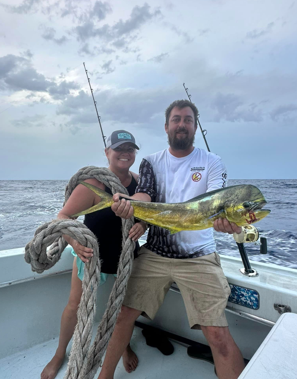 Mahi Mahi, also called dorado or dolphinfish, are one of our most popular offshore targets. They typically run 15-30 pounds, with some bulls pushing 50+. You'll find them around floating debris and weed lines, often within sight of the reef. Mahi fishing is good year-round, but really heats up in summer. Anglers love them for their acrobatic fights, stunning colors, and excellent eating quality. To catch mahi, we usually troll ballyhoo or small lures, or pitch live baits when we spot them. Here's a local tip: when you hook one, keep it in the water. The rest of the school will often stick around, letting you catch multiple fish. Just be ready for chaos when several mahi are hooked at once!
